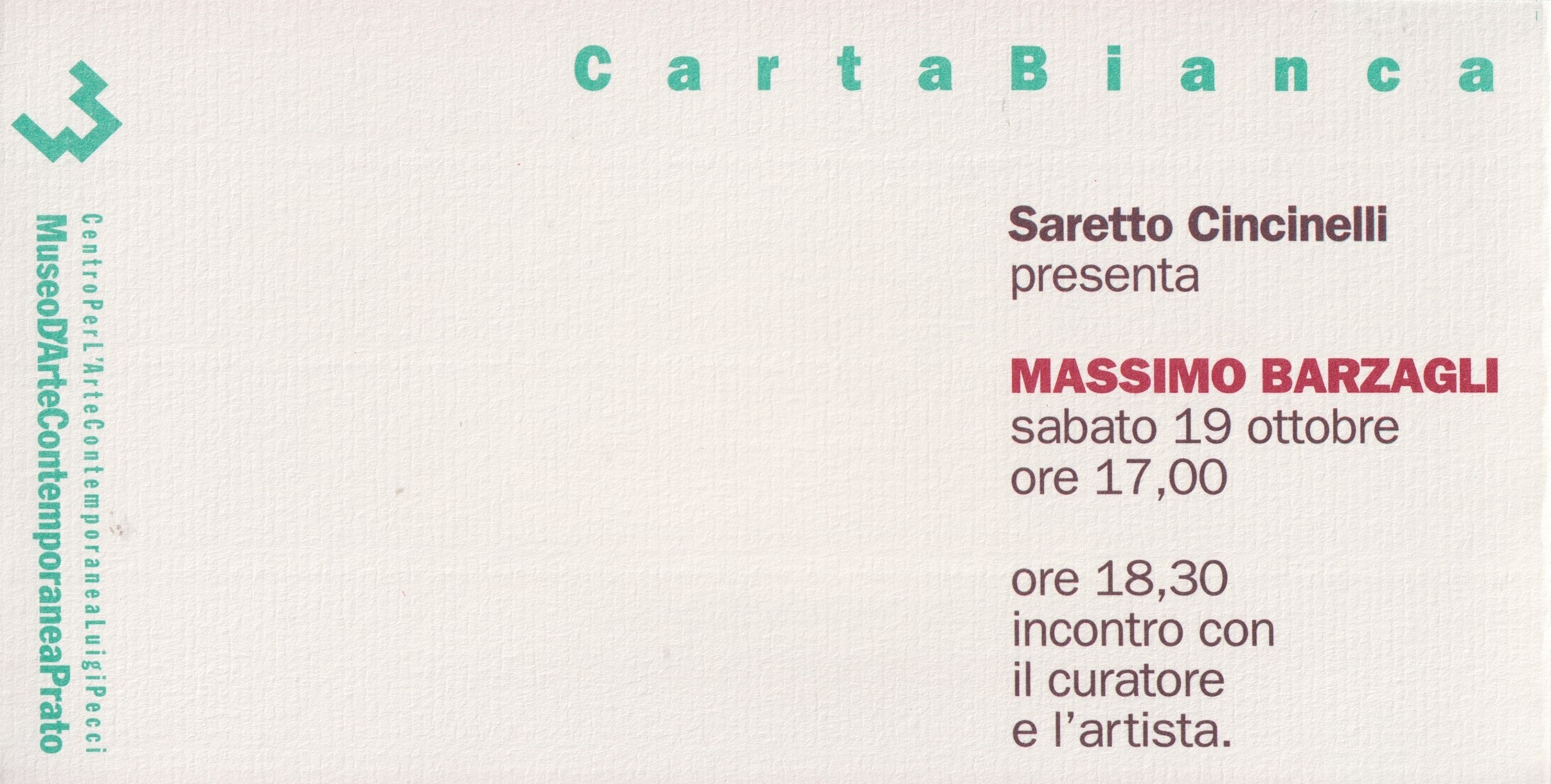 Come scrisse Amnon Barzel presentando la mostra e l'iniziativa, «Carta Bianca è una nuova serie di esposizioni allestite nel museo con le quali si vuole offrire l'opportunità a giovani critici di presentare uno o più artisti di loro scelta. Apriamo questa serie di esposizioni, che dureranno circa un mese, dando "Carta Bianca" a Saretto Cincinelli che ha scelto di presentare Massimo Barzagli. Noi siamo più che lieti di questa scelta».