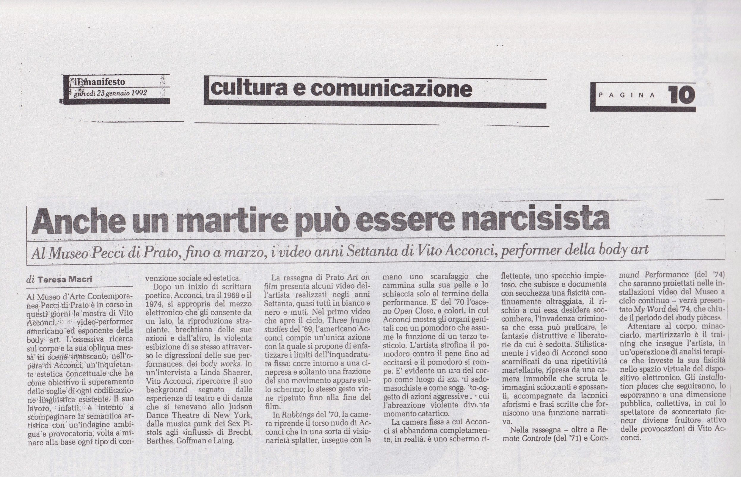 La mostra, dal grande impegno logistico ed economico, si concentrava dunque soltanto sull’ultima fase dell’attività di Acconci: non vi era traccia delle sperimentazioni performative per cui era più celebre, soprattutto presso il pubblico europeo. L'assenza venne compensata con la rassegna Film & Video di Vito Acconci, organizzata dal Centro tra il 25 gennaio e l'1 febbraio 1992.
