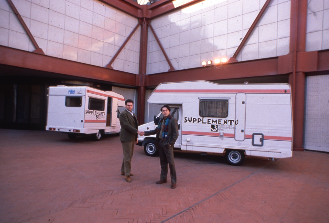 Invitati a partecipare a Una scena emergente, fedeli alla loro prassi decidono di inserire un fascicolo di supplemento al catalogo della mostra. Non solo: i due espongono anche alcune loro opere realizzate precedentemente, ma all’interno di due camper installati nel cortile del Centro. Il nuovo contesto espositivo creato dai due serve da “supplemento” alla mostra, portando per la prima volta l’attività del duo al di là dello spazio editoriale. Sempre nel 1991, contribuiscono con un loro supplemento anche alla trasmissione televisiva BLOB. Un’operazione analoga sancì la loro partecipazione a documenta 9 (1992), con l’offerta di tour guidati di Weimar, e alla sezione Aperto ‘93 della Biennale, con un parco giochi installato all’Arsenale.