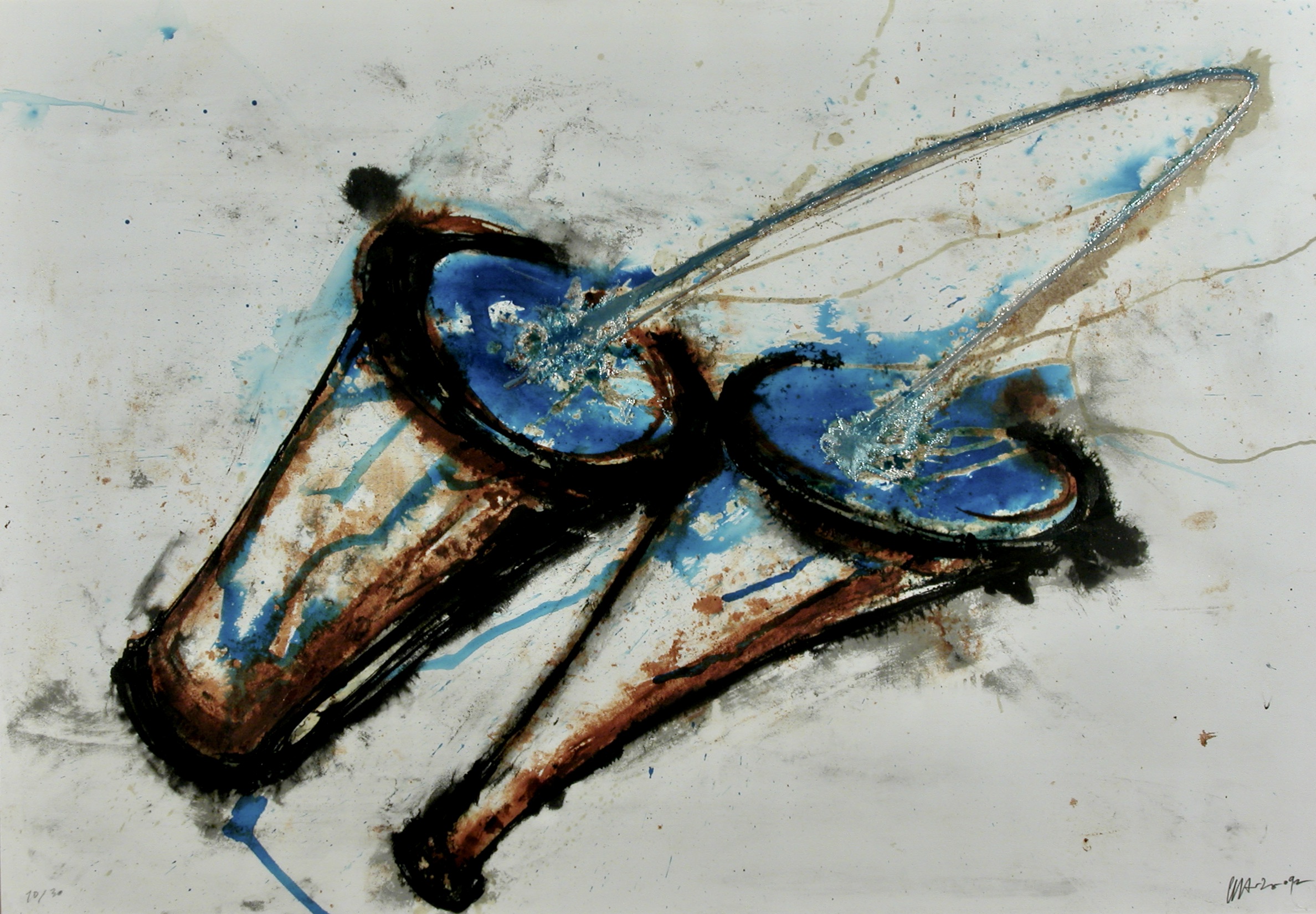 Realizzata in occasione della mostra Gilberto Zorio, ospitata dal Centro Pecci tra l'aprile e il giugno 1992, Crogiuoli è una complessa opera grafica, editata in soli trenta esemplari. Su ognuna delle stampe, raffinate litografie acquarellate e tre colori arricchite da elementi in termorilievo, l'artista è intervenuto applicando una foglia metallica a caldo. Il risultato, imprevedibile e visivamente potente, condensa i flussi di energia su cui Zorio ha concentrato la sua indagine sin dagli anni Sessanta. I crogiuoli raffigurati, come quelli veri e propri esposti all'interno della personale, contengono una reazione chimica che si traduce in una rivelazione visiva: un accadimento energetico nello spazio di un grande foglio di carta da disegno.