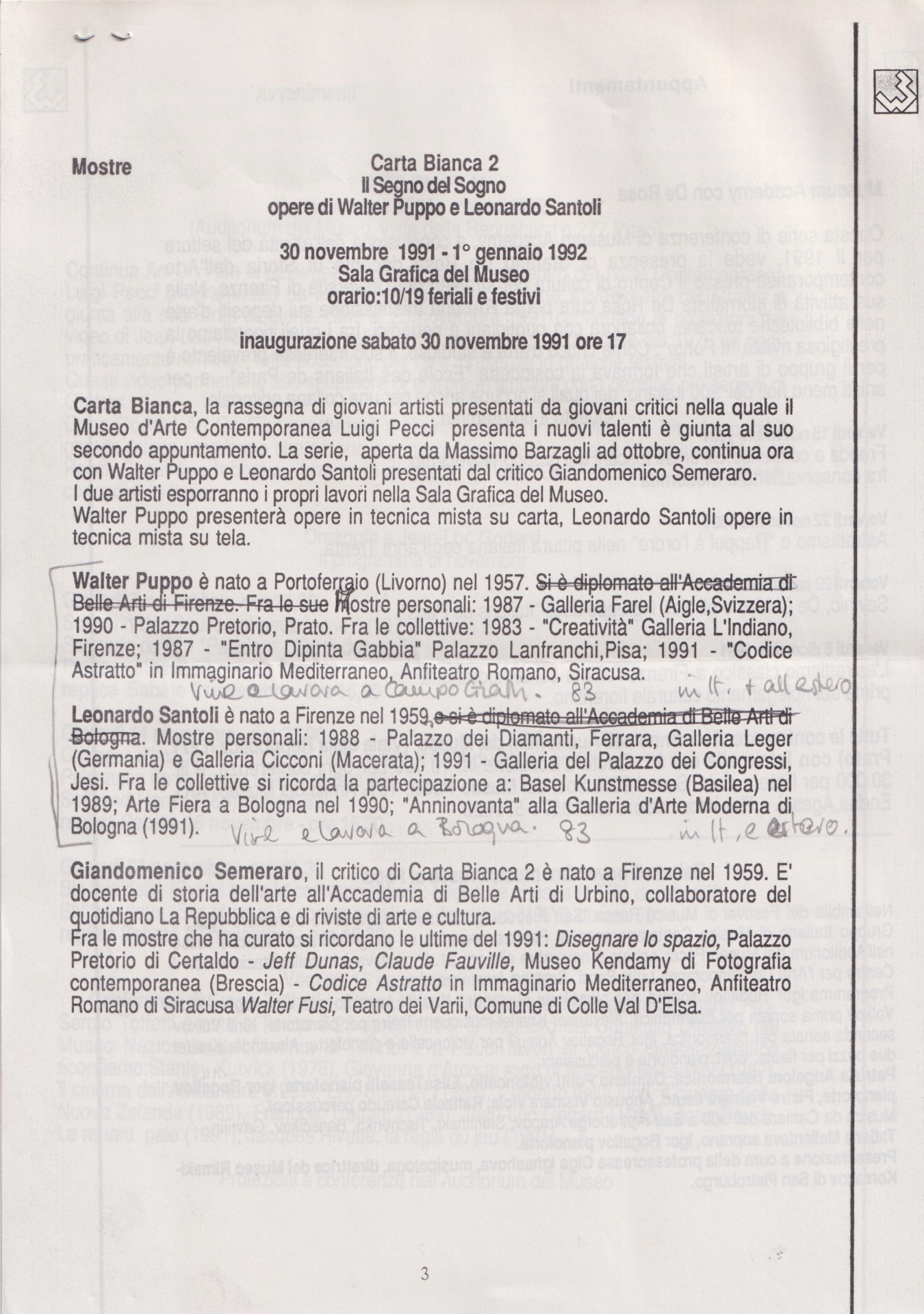 Seconda edizione della rassegna di mostre mensili Carta Bianca, con opere di Walter Puppo (Portoferraio, 1957) e Leonardo Santoli (Firenze, 1959), presentate da Giandomenico Semeraro.