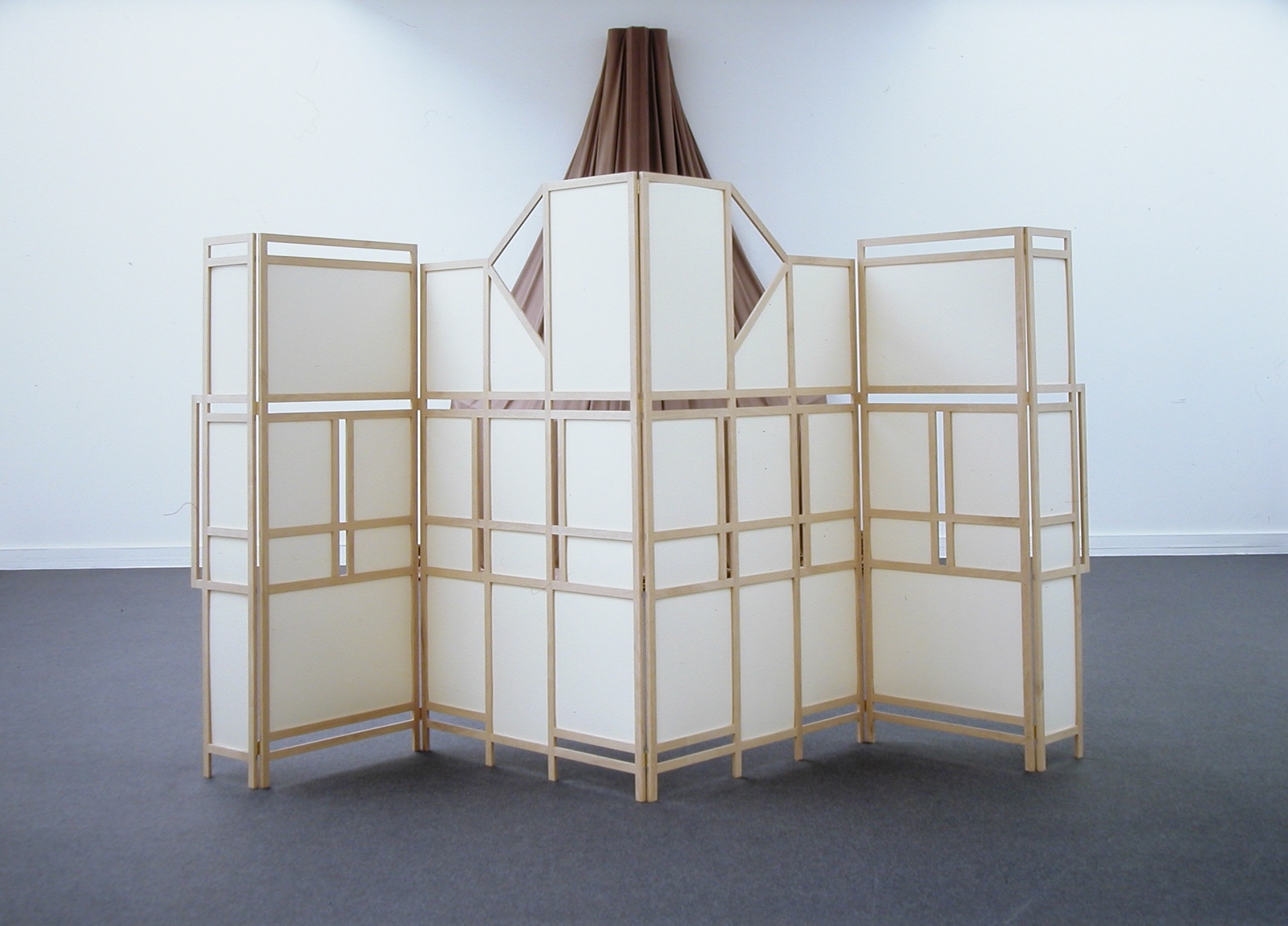 Quello stesso anno è incluso nella collettiva del Centro Pecci Una scena emergente e in quell’occasione il museo toscano acquista l’installazione Senza titolo. Si tratta di una grande paravento architettonico di quattro metri di lunghezza, realizzato con una struttura in legno e pannelli di cartone dipinto. Simmetrica, col suo profilo regolare diviso in campiture rettangolari, la struttura di Senza titolo ricorda la facciata di un edificio, ridotta allo schema cromatico tipico dei modellini, ma portata su una scala inconsueta che non appartiene né agli edifici finiti, né ai modelli prepatori. Nel catalogo della mostra l’artista pubblica anche un disegno preparatorio, a conferma del valore progettuale della costruzione.